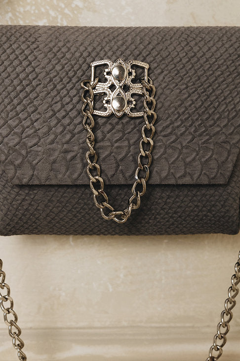 Handcrafted leather suede small bag with nickel or gold metal details. Comes with adjustable leather strap and a chain strap. It can be worn also as clutch bag.