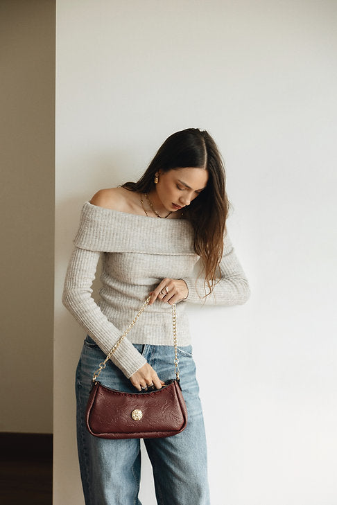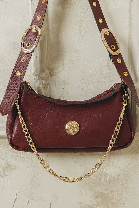 Handcrafted leather shoulder bag with carved nickel or gold metal details. Comes with double strap, one leather adjustable strap and one chain strap. Contains removable leather wallet.