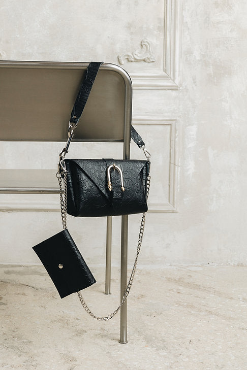 Handcrafted leather shoulder bag with buckle which combines nickel and gold metal color. Comes with double strap, one leather strap and one chain strap. Metal details can be nickel or gold. Contains removable leather wallet.