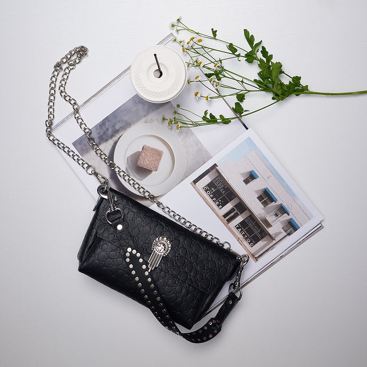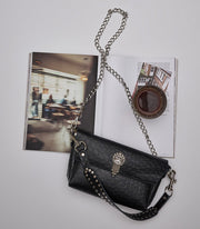 Handcrafted leather shoulder bag with carved nickel metal details. Comes with double strap, one leather strap and one chain strap. Contains removable leather wallet.