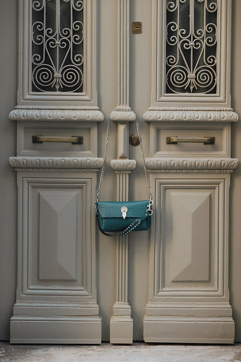 Handcrafted leather shoulder bag with carved nickel metal details. Comes with double strap, one leather strap and one chain strap. Contains removable leather wallet.