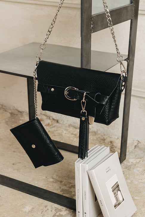 Handcrafted leather bag with with gold or nickel metal details. Comes with removable leather wallet and two straps. A leather strap adjustable and a chain strap. Also comes with a removable charm.