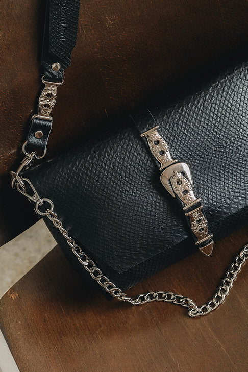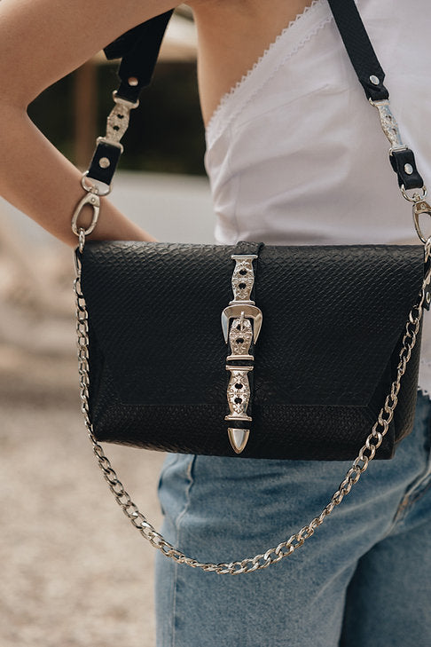 Handcrafted leather bag with with gold or nickel metal details. Comes with removable leather wallet and two straps. A leather strap adjustable with metal details and a chain strap.