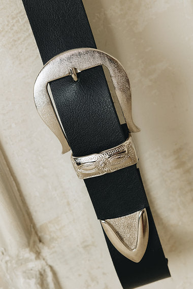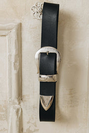 Handcrafted adjustable leather belt with gold or nickel metal details. The belt closes from behind.