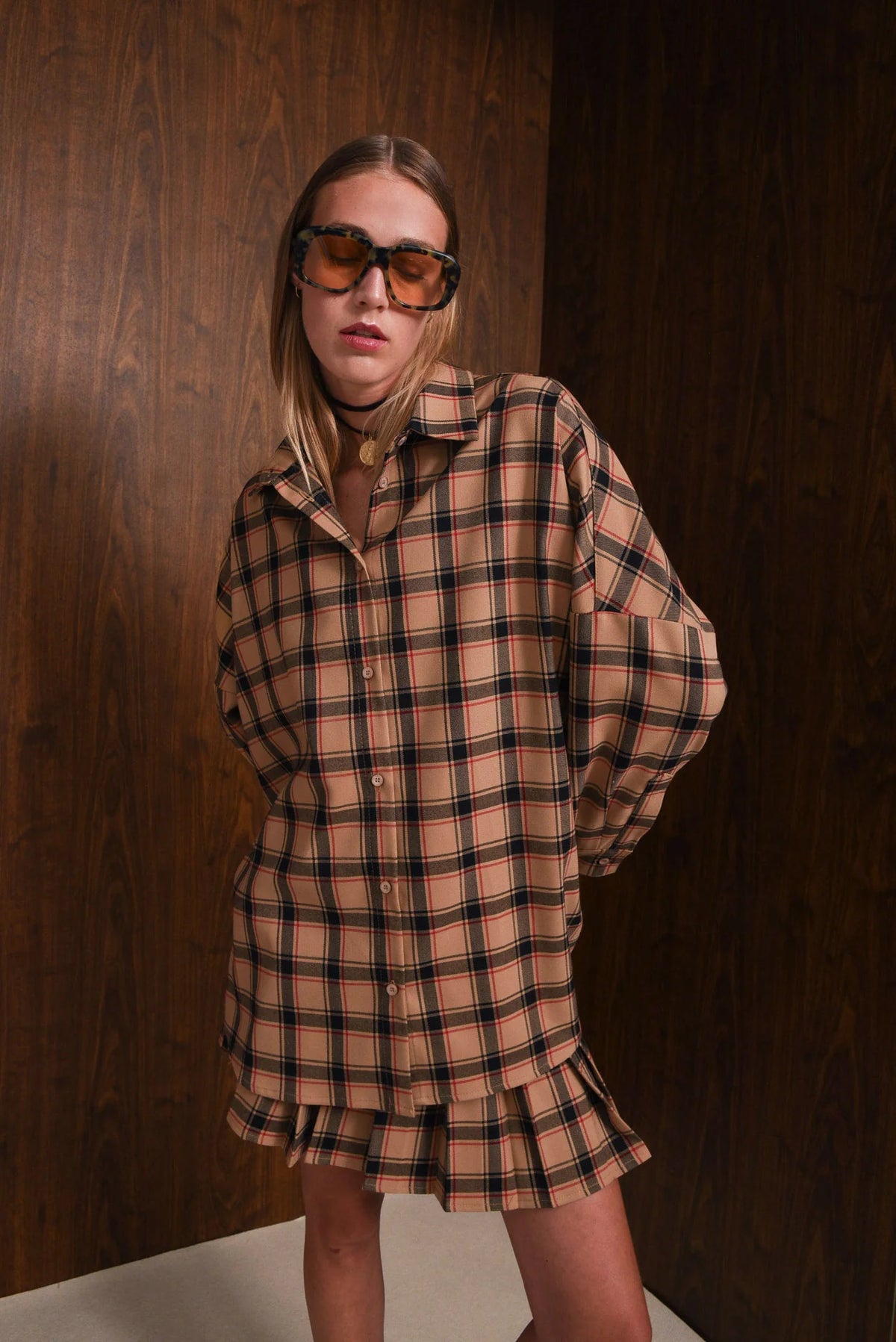The Affect Shirt features an oversized fit with dropped shoulders, a pointed collar, and a full button-down front. Made from soft checked fabric, it includes long sleeves with buttoned cuffs and a curved hem that’s slightly longer at the back. Comfortable and versatile, it pairs easily with jeans, skirts, or tailored pieces.