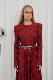 TheRole Dresshas long sleeves, a round neckline and a floor-length A-line silhouette. Made from soft pleated fabric, it has subtle texture and a smooth drape. Light shoulder structure gives shape, while the fitted waist flatters the body.