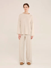Pants made from soft, fluffy fabric, featuring ribbed panels along the side seams for a subtle, elevated detail. It features an elasticated waistband and has a comfortable fit that gently hugs the silhouette, allowing full freedom of movement. The relaxed cut and small slits at the hems enhance both comfort and flow. It perfectly pairs with the matching tops from the same range for a refined, cozy ensemble.