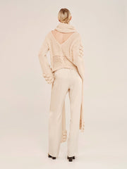 Knitted long-sleeve blouse made from a wool blend, featuring a cozy textured knit and decorative bobbles. The long sleeves fully cover the arms, while the flattering scoop neckline at the front is paired with a V-shaped back, adorned with unique cable-knit detailing. A uniquely comfortable, warm, and soft knit garment — perfect for casual winter outfits!
