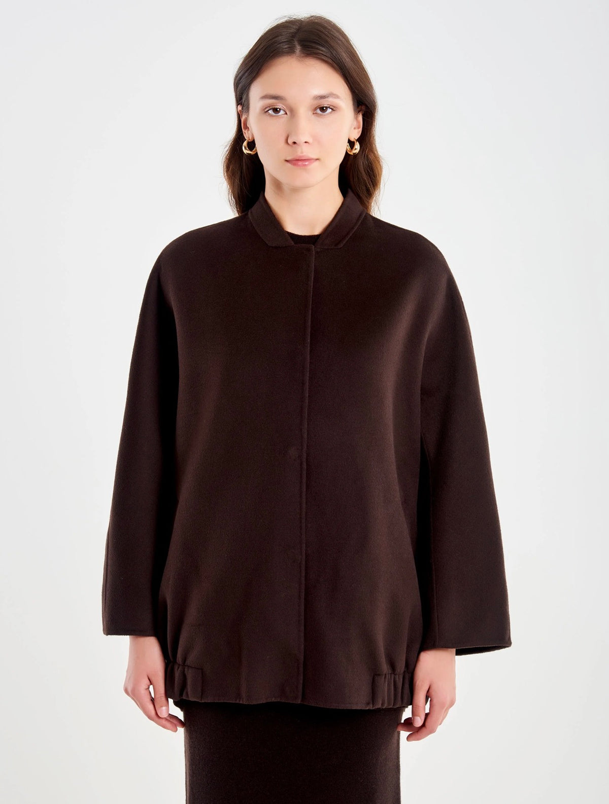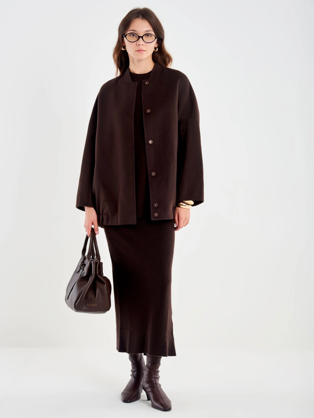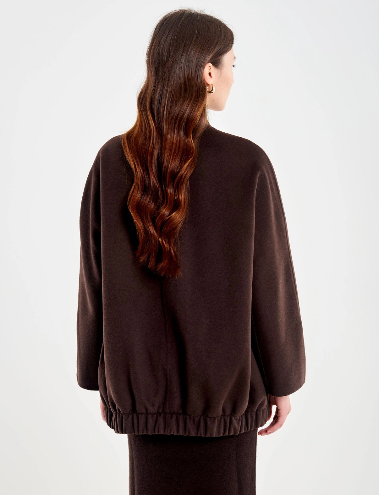 Wool blend bomber jacket with long sleeves. Round neck. Concealed metal snap closure. Patch pockets. Elasticated hem. Composition: 50% Wool, 50% Polyester Lining: 55% Polyester, 45% Viscose The model is 177 cm tall and wears a size S.