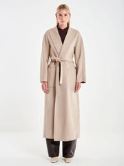 Long shawl coat in a wool blend. Lapel collar and long sleeves. Front patch pockets. Self-fabric belt closure.