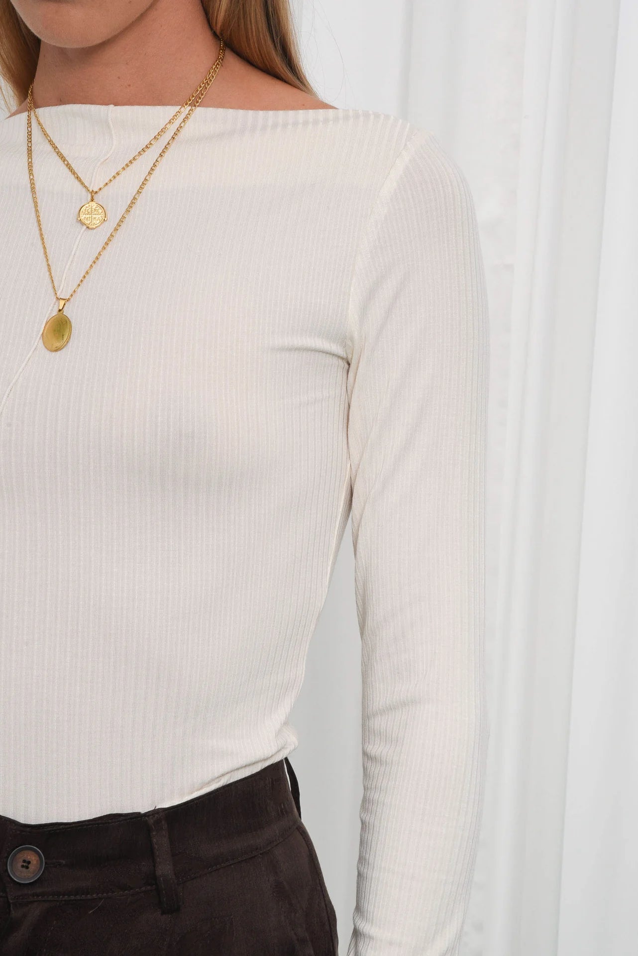 The Respect top is a fitted long-sleeve blouse made from soft ribbed fabric for comfort and stretch. It features a boat neckline and a unique diagonal seam detail across the front, adding a modern twist to a timeless design.