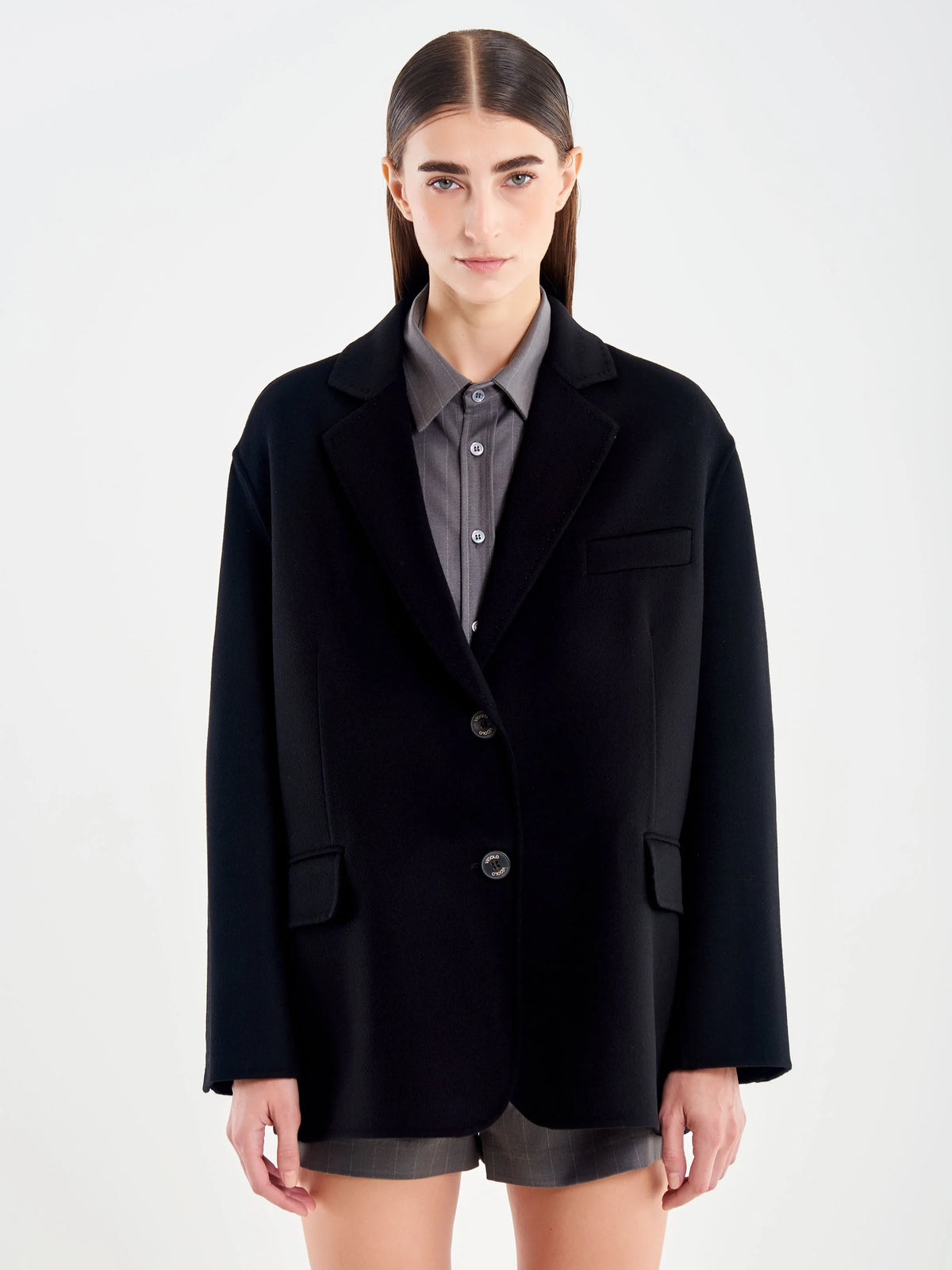 Oversized wool jacket with lapels and long sleeves. Single-breasted front closure with two buttons. Flap pockets. Back vent.