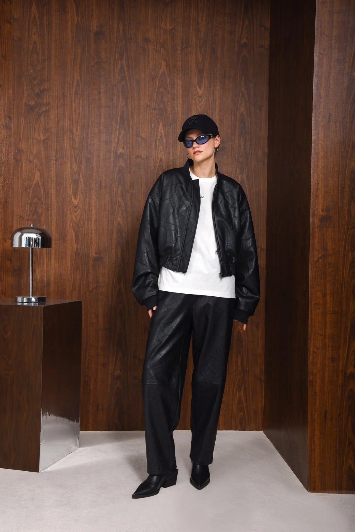 The Identity Faux Leather Pantsblend structure and ease in a contemporary silhouette. Crafted from soft, textured faux leather with a patchwork effect, they feature a relaxed fit, elastic waistband, and straight leg. Comfortable yet elevated, these pants are easy to style and perfect for any occasion.
